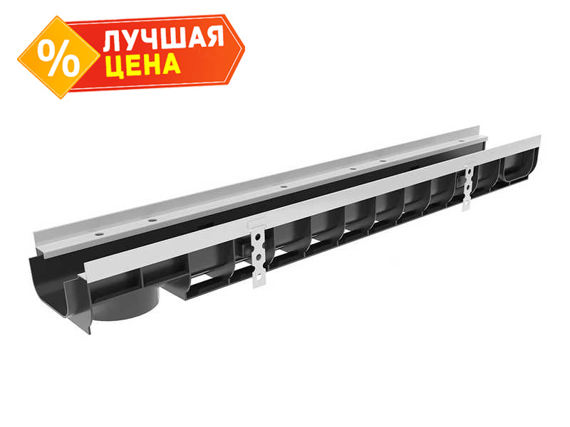 Снабжен стальными направляющими для закрепления водоприемных решеток, держателями, фиксирующими лоток к основанию в продольном и поперечном направлениях. Имеет систему стыковки (торцевую и под углом 900) с аналогичными водоотводными лотками. Оснащен ребрами жесткости по всей длине изделия.