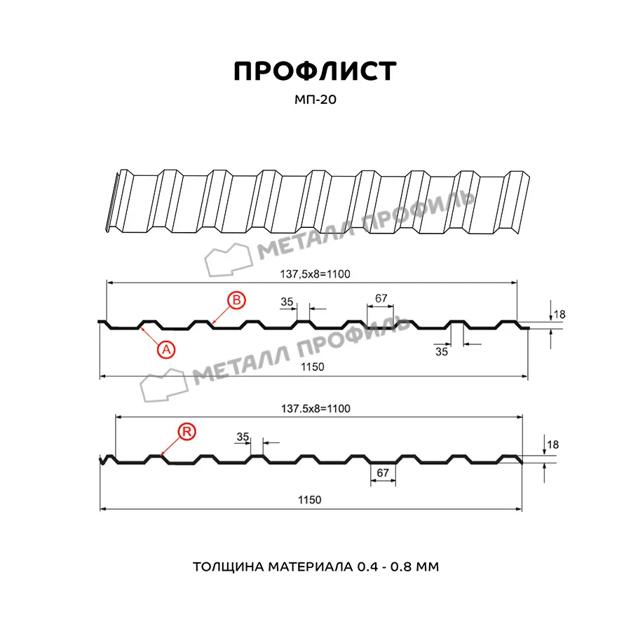 Профлист МП-20 является поистине многоцелевым стройматериалом. В сравнении с другими модификациями профлиста, он изготавливается в трёх версиях: А, В и R. Разновидности А и В применяются для кровельных работ, возведения ограждений, облицовки стен, для внутренней отделки промышленных помещений, гаражей, ангаров и т.п. Вариант с литерой R отличается присутствием капиллярной канавки и предназначен в качестве кровельного покрытия. В зависимости от сферы применения, данный профлист выпускается из металлопроката толщиной от 0,4 до 0,8 мм. Обратите внимание: несмотря на цифру 20 в названии, на самом деле глубина этого профнастила – 18 мм. Он является материалом эконом-класса и обладает доступной ценой. МП-20 – прочный и качественный стройматериал, преимущества которого по достоинству ценят не только частные домовладельцы, но и крупные застройщики. Он отличается приличной жёсткостью, выдерживает значительные статические нагрузки и эффективно противостоит нагрузкам динамическим.