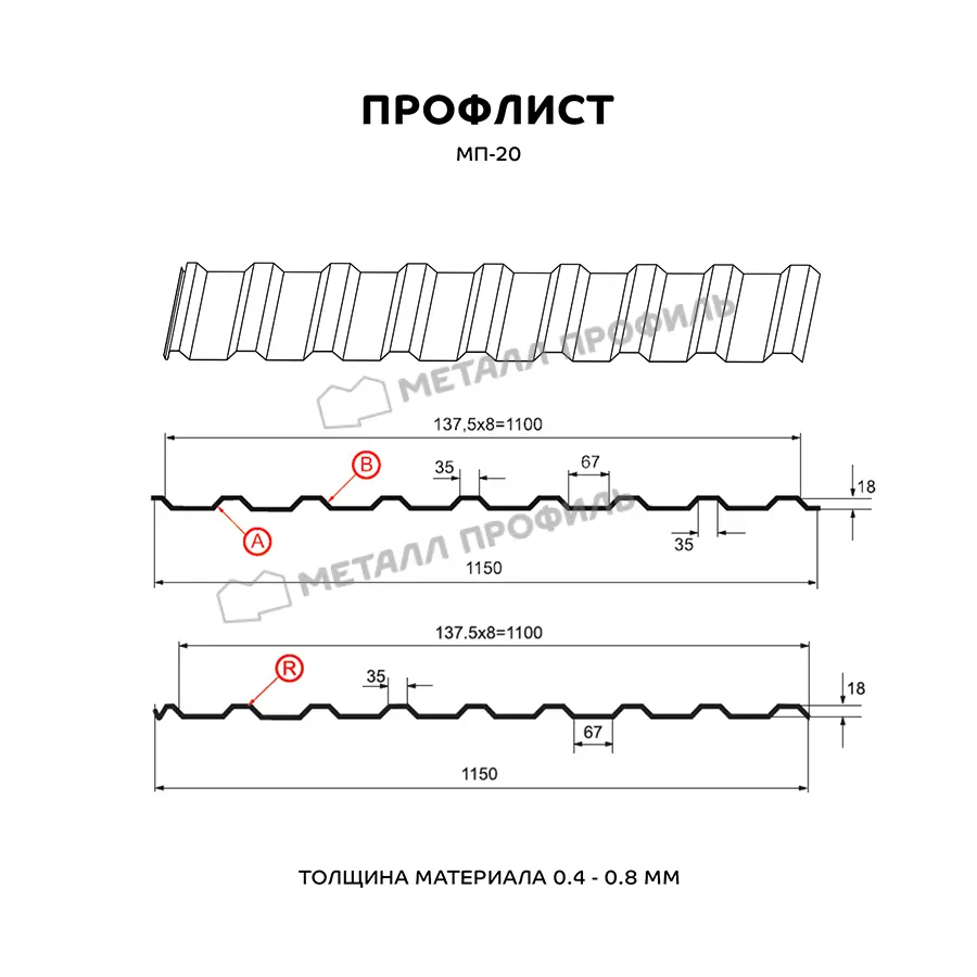 Один из востребованных в Анапе профлистов с небольшой глубиной гофры – 18 мм. Указанная в названии цифра 20 – на самом деле просто округлённое число точной величины. Значительный выбор толщин, в которых возможен выпуск МП-20, а также его прочностные свойства допускают применять МП-20 в самых различных областях. Профиль 0,35-0,4 мм подойдёт для отделки внешних стен, поскольку не несёт никакой нагрузки. В данном случае важен минимальный вес и финишное покрытие, придающее оттенок и фактуру изделию. Для обустройства кровельных скатов лучше применять профиль с толщиной от 0,5 мм – он прочностью, чтобы противостоять снежным массам и дождям. Для монтажа ограды наилучшим выбором станет профлист толщиной 0,4-0,5 мм. Более толстый профиль используется уже в роли стеновых перекрытий в хозяйственных помещениях, для постройки каркасных сооружений (гаражей, павильонов, киосков).